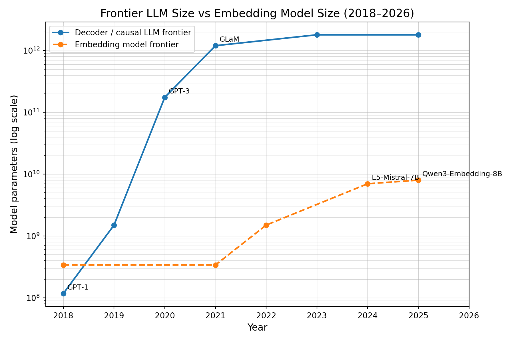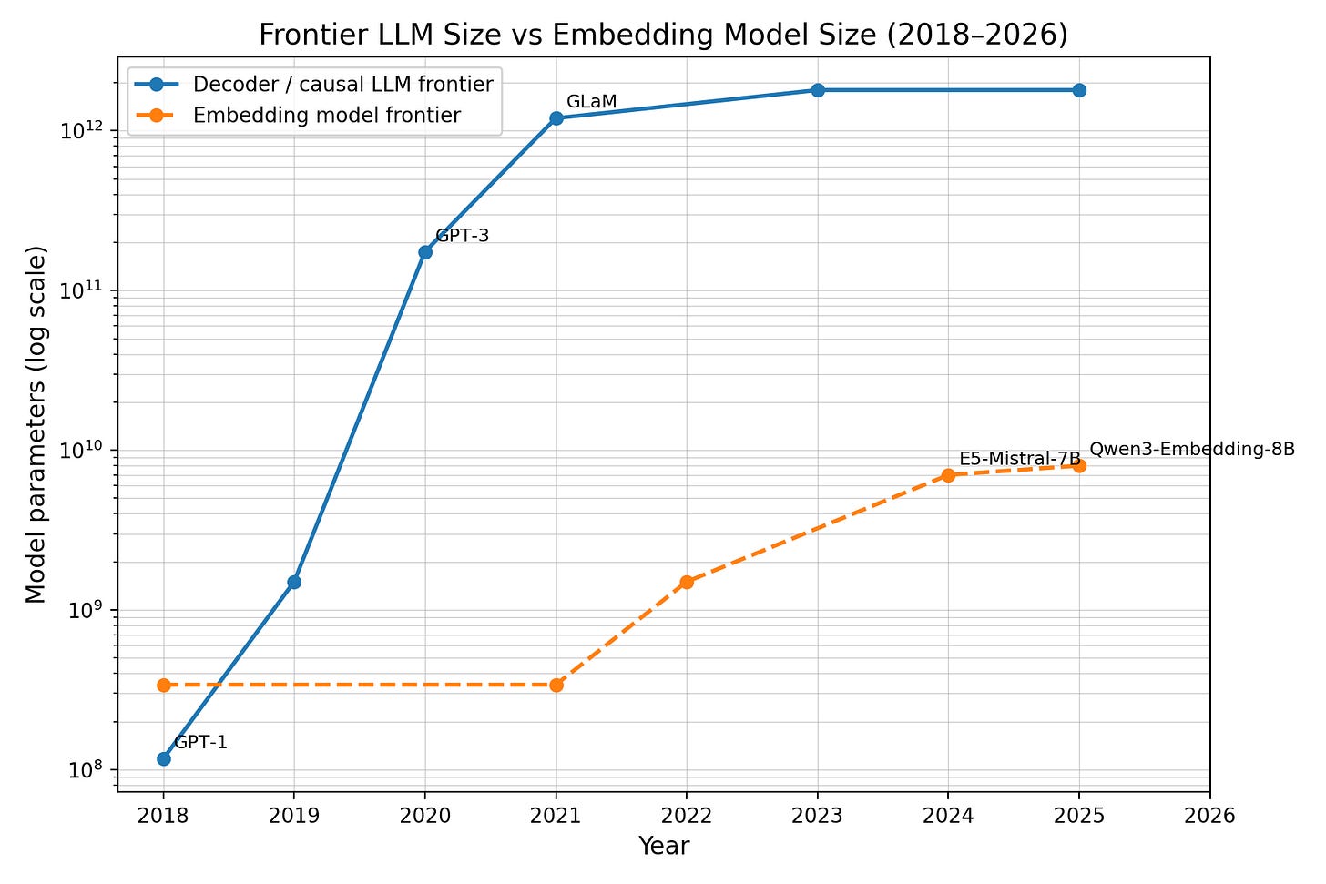 The best LLMs get bigger every year, while embedding models haven’t grown past the eight-billion parameter scale. (Thanks for the graph, chatGPT!)